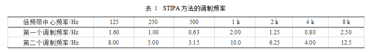 STIPA是完整STI的一种简化形式,称之为公共广播系统语音传输指数。它是基于使用较少数量的调制指数进行的测量。STIPA测试信号仅由1个测试信号组成,在7个倍频带中的每一个波段都预设两个调制如表1所示。这14个调制指数是同时产生的。一次测量时间仅需15~25s,比完整STI要短得多,是直接方法的主要应用途径。调制指数也可以使用间接法得出,称为STIPA(IR)。